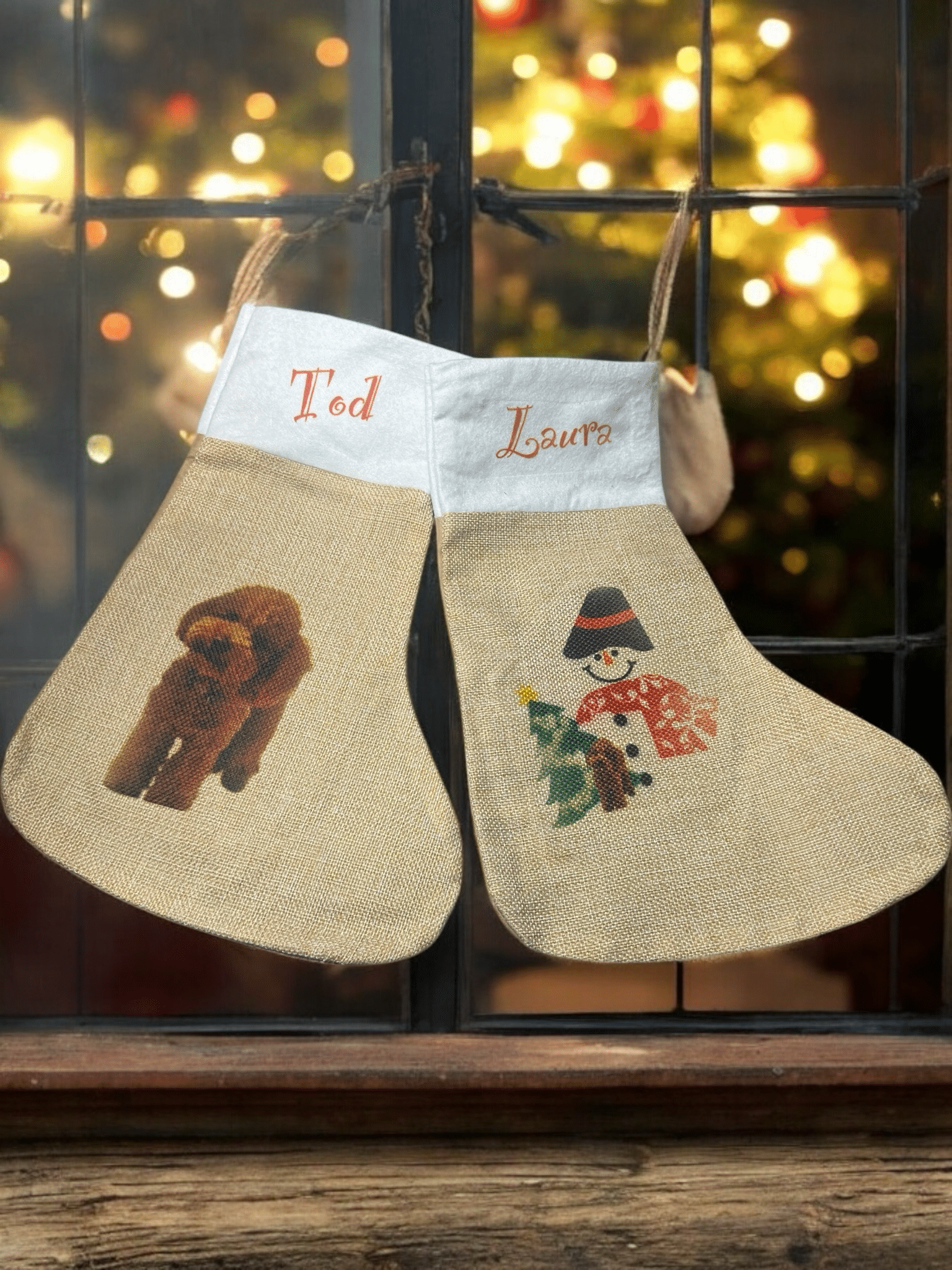 Puedes personalizarlo con la foto de un niño, una mascota, tu pareja, un dibujo hecho a mano o cualquier imagen significativa, acompañada del nombre que tú elijas. El resultado es un calcetín decorativo con un valor sentimental enorme, ideal para colgar en la chimenea, en la pared o bajo el árbol.